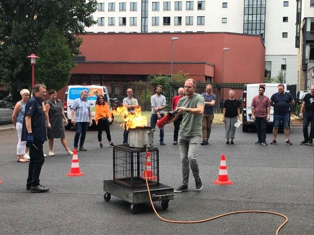 Auch eine praktische Löschübung mit Handfeuerlöschern wurde durchgeführt, bei der alle Teilnehmer mit unterschiedlichen Löschmitteln (CO2 /Wasser) selbst simulierte Brände löschen konnten.